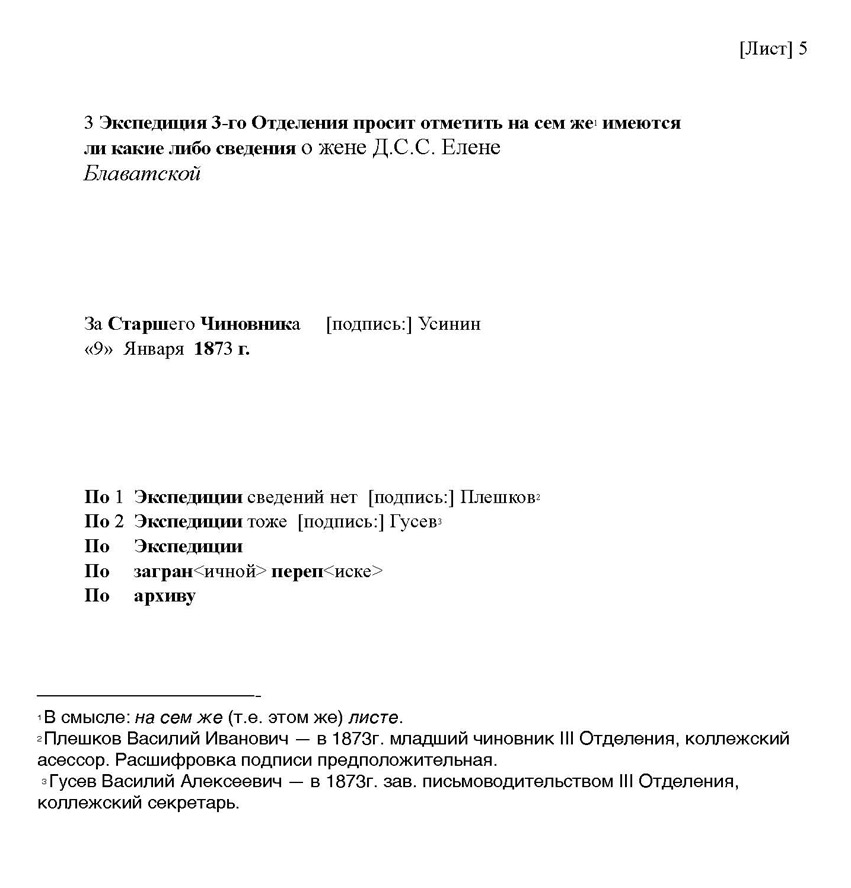 Как видно из этой справки и первой карандашной записи на донесении одесского жандарма (см. далее), на начало 1873 г. в делах первых трёх экспедиций III Отделения никаких сведений о Е.П.Блаватской не обнаружилось. По-видимому, прежде всего были просмотрены дела, находившиеся в 3-й экспедиции (по прошествии трёх лет они передавались в архив), после чего понадобилась данная справка.